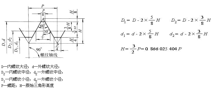 普通公制牙型角=60°螺纹尺寸计算公式:D1=D-2x5/8H d1=d-2x5/8H D2=D-2x3/8H d2=d-2x3/8H H=0.8660254P