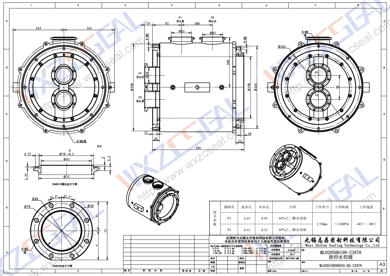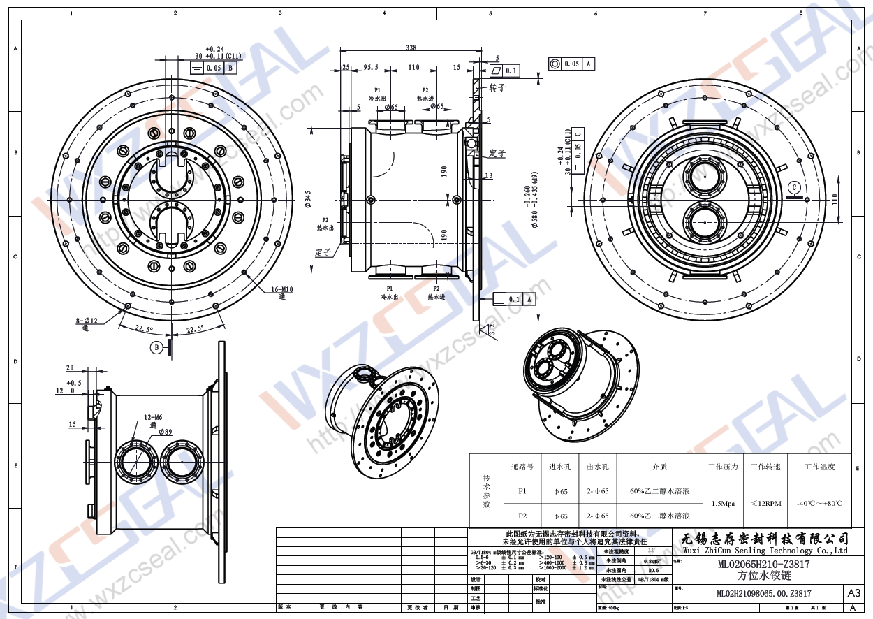 技术参数 访问号 进水口 出口孔 中 工作压力 工作速度 工作温度 P1 & phi;65 2-& phi;65 60%乙二醇水溶液 1.5Mpa ≤12转/分 -40℃ ~+ 80°C P2 & phi;65 2-& phi;65 60%乙二醇水溶液